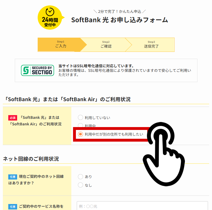 既にソフトバンク光を契約中で同一名義で2回線目以上(複数契約)の申し込みとなる場合には[利用中だが別の住所でも利用したい]にチェックを入れてください。