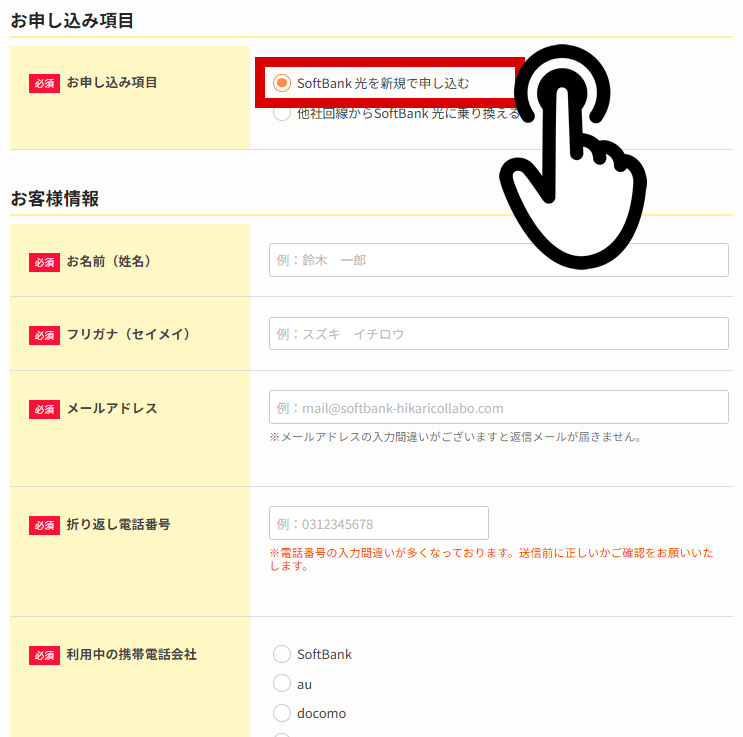 お申し込み項目では[SoftBank 光を新規で申し込む]を選択します。