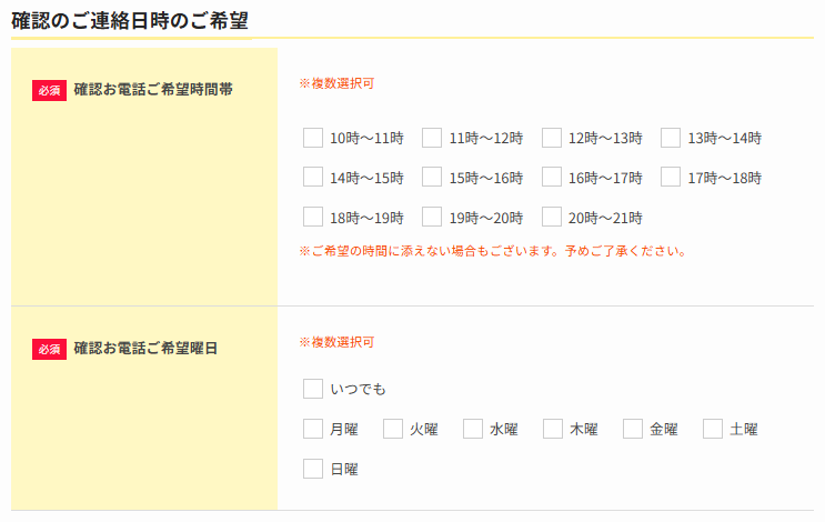 申込画面で選択した確認電話の希望時間・希望曜日に確認電話があります。