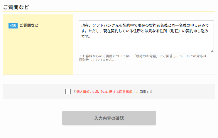 最後に質問などを入力できる欄に、「ソフトバンク光を契約中である」ことや「同一名義での契約だが別住所での契約ある」ことを必ず記載しておきましょう。