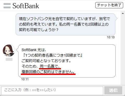 SoftBank公式サイトでソフトバンク光を同一名義で複数契約可能かを質問してみました。