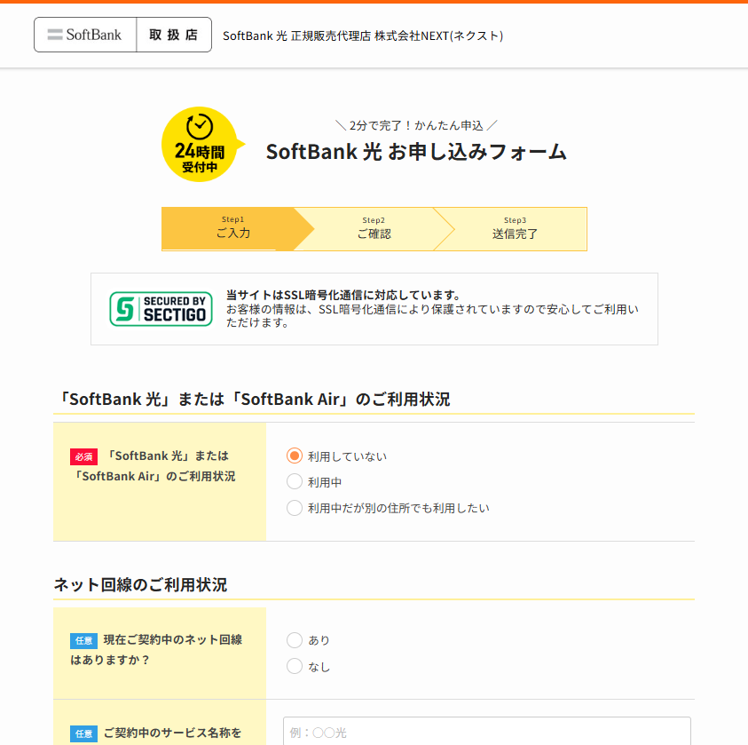 ソフトバンク光をオンラインで申し込める申込受付サイトを運営する正規代理店は何社がありますが、今回は正規代理店NEXTの申込受付サイトでオンライン申し込みをしたと改定して解説します。
