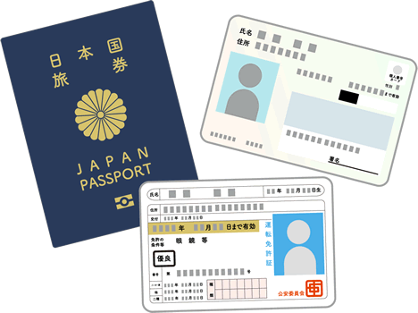 • 日本国政府発行の顔写真、氏名、生年月日、現住所が記載で有効期限内のもの。