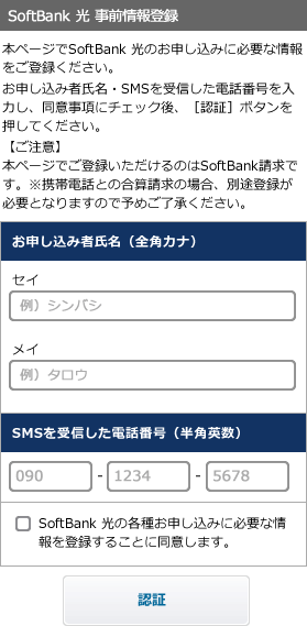 事前情報登録を完了させないとSoftBankでソフトバンク光の契約審査が行えませんので、携帯電話のSMSに事前情報登録にアクセスできるURLが届いたらその場で登録することをおすすめします。