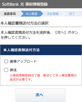 上記のStep3での認証が終了すると、続いてソフトバンク光の契約者となる方の[本人確認書類]の送付方法を選択します。