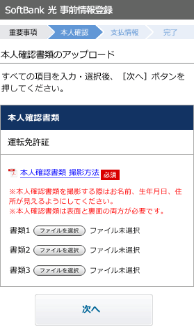 事前情報登録とは、ソフトバンク光の契約審査に必要となる[本人確認書類の提出]のほか、ソフトバンク光の月額料金の[支払い方法の登録]を行うページのことです。