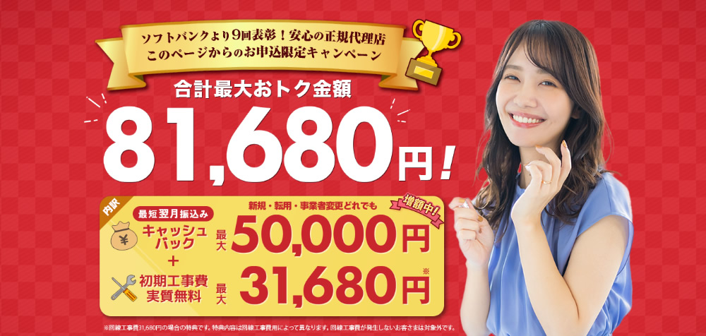 ソフトバンク光を法人名義で契約するのではなく[法人代表者の個人名義]で契約可能であれば正規代理店NEXTの申込受付サイトの特設ページ経由で契約すれば最大50,000円キャッシュバックが受け取るのでお得に契約可能です。
