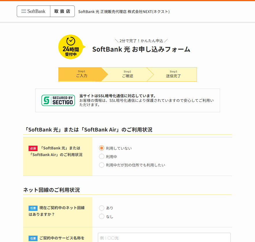 正規代理店NEXTの申込受付サイトの申込画面では、ソフトバンク光の[契約者名]や連絡先となる[メールアドレス][電話番号]、ソフトバンク光を契約する[郵便番号][住所]などを入力/選択します。