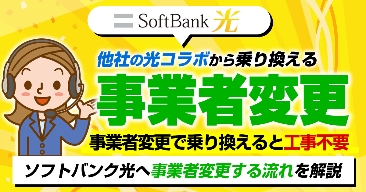 この記事では、他社光コラボレーションをご契約中の方を対象に、ソフトバンク光へ工事不要で乗り換えられる[事業者変更]の基礎知識をはじめ、事業者変更の申し込み時に必要な”事業者変更承諾番号”の取得方法、ソフトバンク光へ事業者変更で乗り換える流れを中心に解説します。