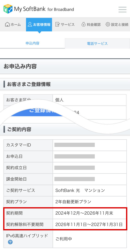 契約しているソフトバンク光の契約期間や契約解除料不要期間は、会員ページのMy SoftBankにログインして[お客様情報]ページで確認できるほか、契約更新月の前日にSMSでお知らせも送信されてきます。