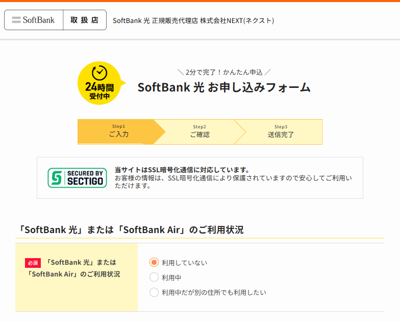 まずは、正規代理店NEXTが運営する申込受付サイトにアクセスしてソフトバンク光を申し込みます。