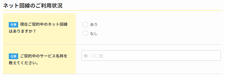 続いて、現在契約しているインターネット回線がある場合は[あり]を選択して契約中のサービス名を記入してください。(ただし、任意なので選択/記入しなくても可能です。)