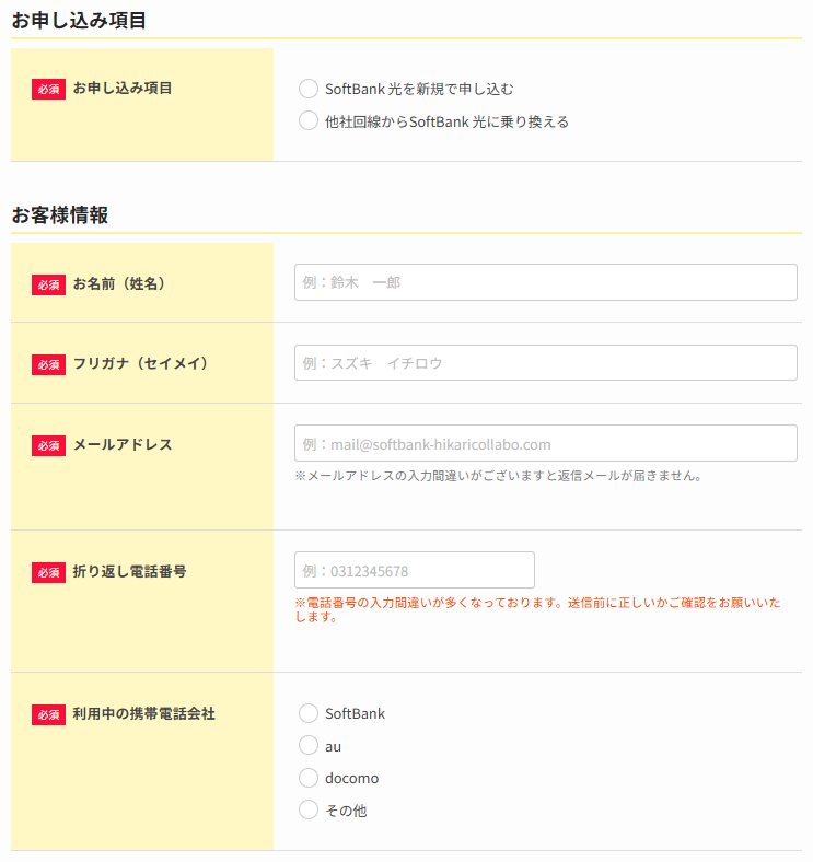また、ソフトバンク光を契約する方の契約者氏名や連絡先(メールアドレス・電話番号)を入力してください。