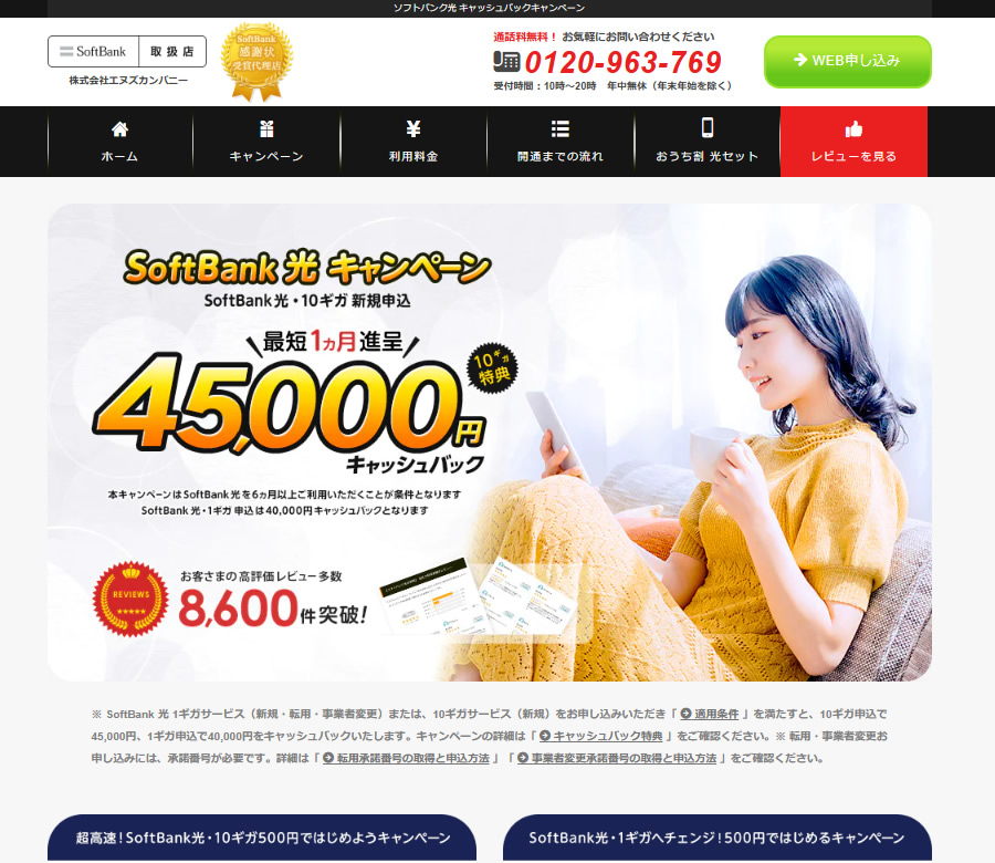 2025年12月現在、株式会社エヌズカンパニーは自社で運営する申込受付サイト経由でソフトバンク光を契約した方を対象に独自特典として45,000円をキャッシュバックするキャンペーンを実施しています。