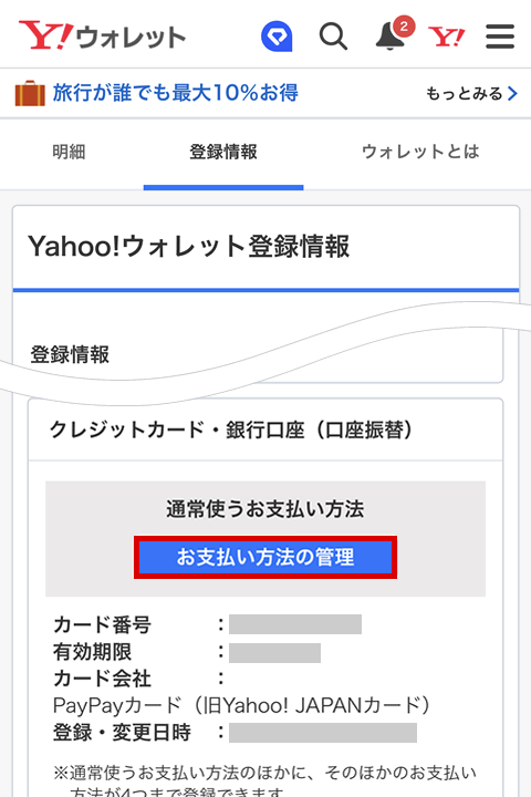 Yahoo!ウォレット請求で登録済みの支払い方法の変更