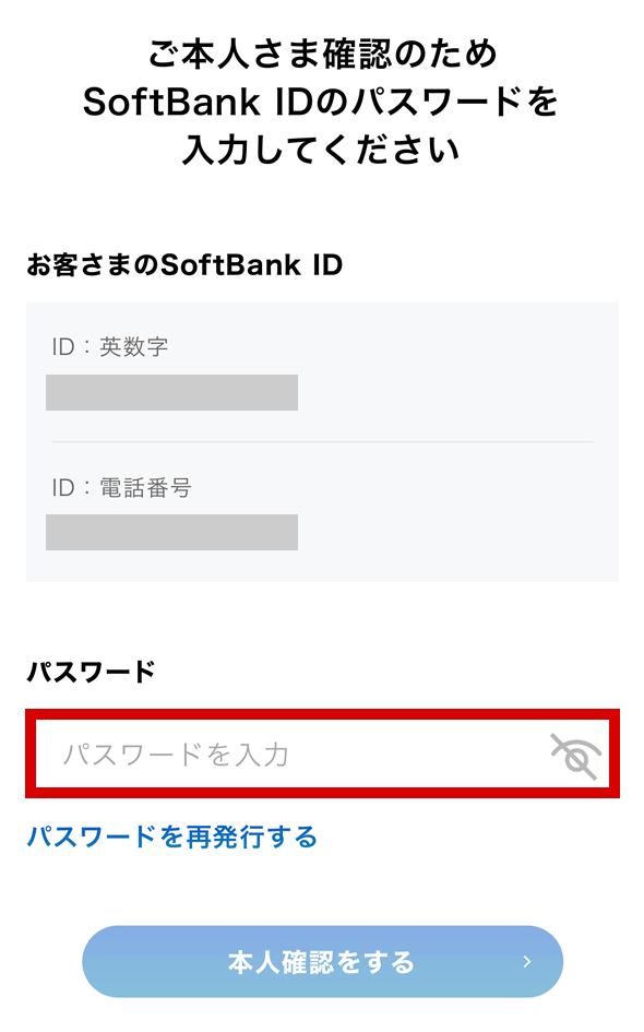 SoftBank携帯電話の会員ページ「My SoftBank」にログインするためのパスワードを入力して本人確認をするを押します。