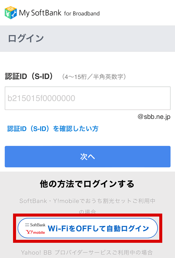 SoftBankもしくはY!mobileの携帯電話をご契約中で、尚且つソフトバンク光と携帯電話のセット割引である「おうち割 光セット」を適用中の場合は、SoftBank/Y!mobileの携帯電話からWi-Fiを切った状態でMy SoftBankにアクセスして[Wi-FiをOFFして自動ログイン]ボタンを押すことでもログイン可能です。