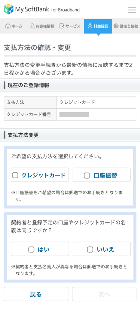 ソフトバンク光の登録済み支払い方法の変更は「支払い方法(請求方法)」によって変更手順が異なっています。