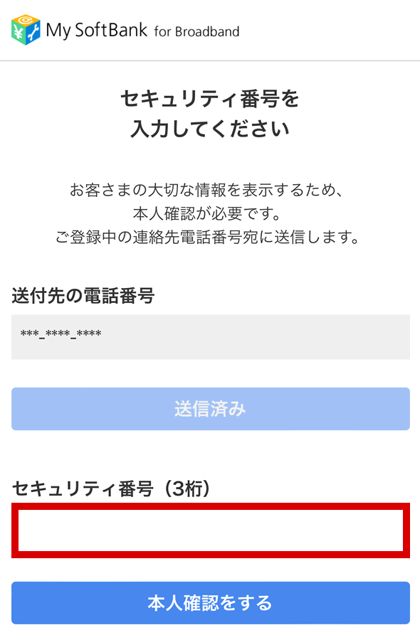 送信するボタンを押してしばらくすると、ソフトバンク光の申し込み時に登録した携帯電話のSMSに3桁の「セキュリティ番号」が送信されてきますので、「セキュリティ番号」を入力して本人確認するボタンを押します。