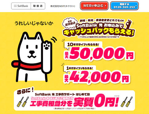 | ソフトバンク光 1ギガ 新規契約 | 正規代理店NEXTなら 50,000円 キャッシュバック |