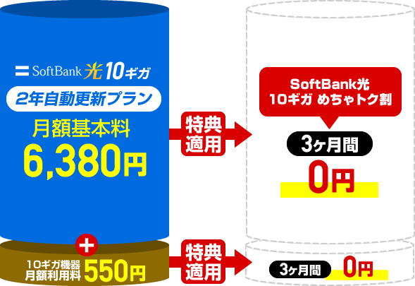 [SoftBank 光・10ギガ めちゃトク割]の適用により、2~3ヶ月目は[月額基本料+機器利用料]は0円となります。