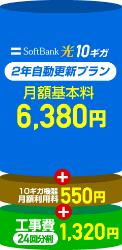 以下では、ソフトバンク光 10ギガを「2年自動更新プラン」で契約して、回線工事費を24回分割(月々1,320円)で支払う契約をしたと仮定して毎月の請求額を解説します。