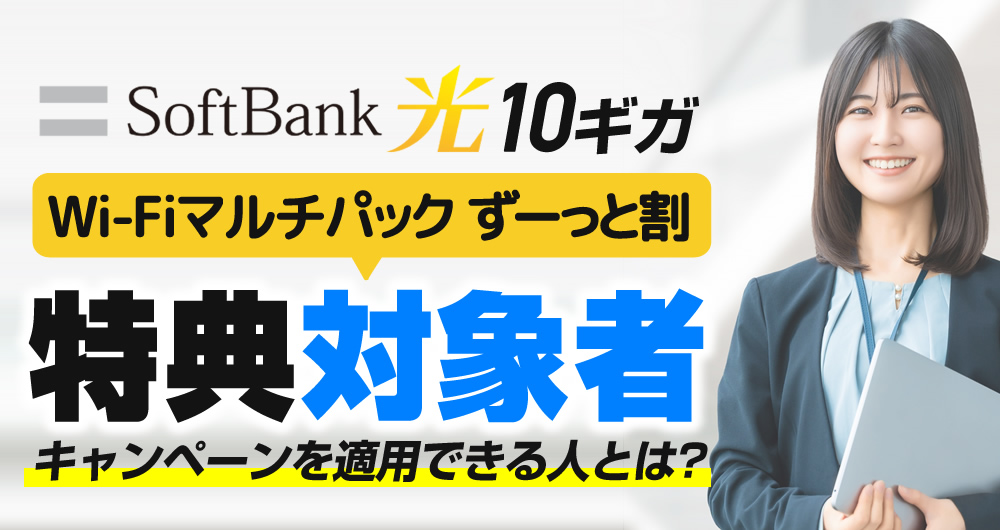 この記事ではソフトバンク光 10ギガの公式キャンペーンである[SoftBank 光・10ギガ Wi-Fiマルチパック ずーっと割]を適用可能な対象者やキャンペーン内容、そして適用条件について詳しく解説します。